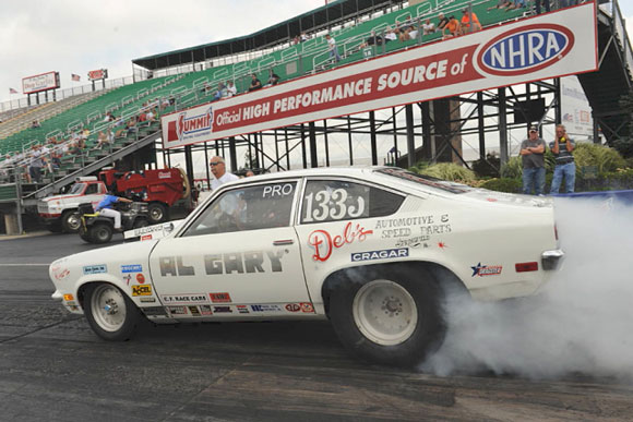 "Michigan's Dan Timoszyk is the owner of this true piece of history. This 1971 Vega is basically un-restored and was a familiar sight at Englishtown and other east coasts tracks back in the seventies. Campaigned by Al Davis, the car ran in D/Gas and in occasional Pro Stock match races. The original 1969 302 DZ drive train is still in place!"