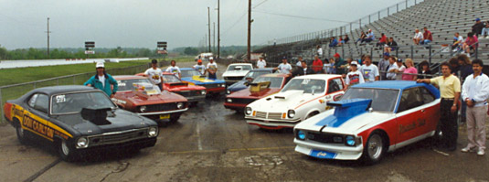 Photo from left to right: Jeff Johnson's Wire Car Duster, Bill Porterfield's Dickie Harrel Camaro; Ron Walker's Motown Missle Duster, Glenn Hicks' Sox & Martin Duster, Dave Lyal's Wild Thang Mustang, Parker and Ross' Pinto, Gary Phillips' Billy the Kid Arrow, Glenn Sharp's Jenkins Vega and Dominic Durinzi's Sox & Martin Colt. Photo by Richard E. Osborne.